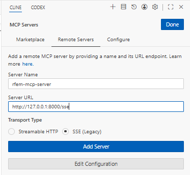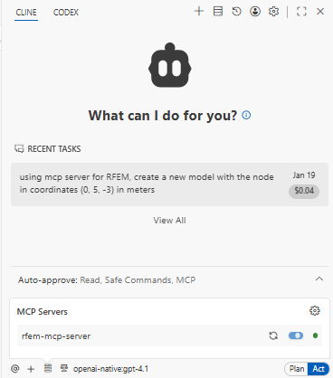 Now, Cline will connect to the Dlubal MCP server via the URL, and you can begin using AI chatbot to start interacting with RFEM using plain text.
