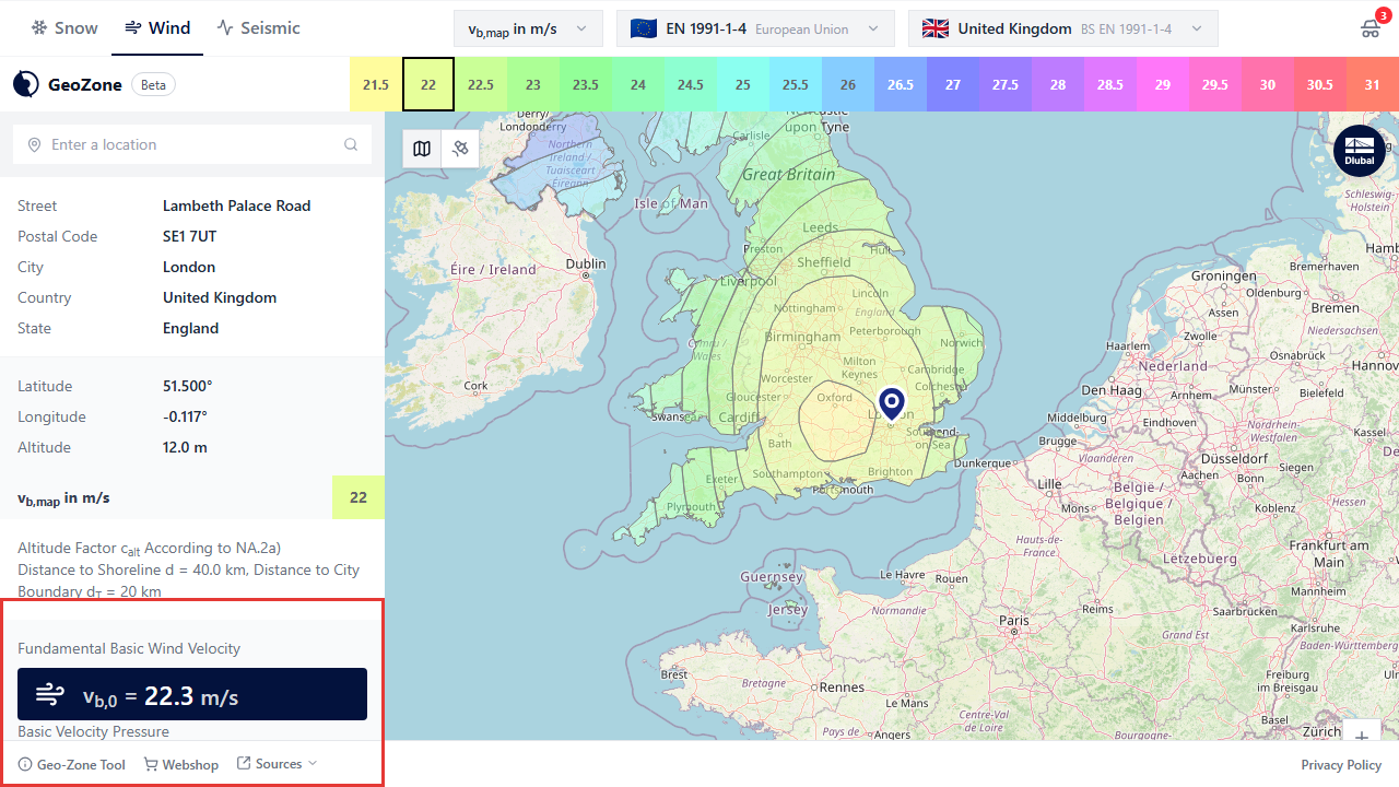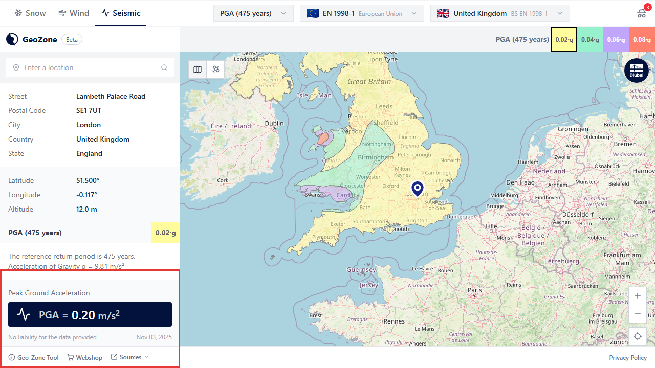 Accepts a free-text address and filters — load_zone_type, standard, annex, and layer_id — to narrow results to a specific zone type or country annex. Returns resolved address details, the matched zone value, and an ordered list of structural load characteristics grouped by standard and annex.